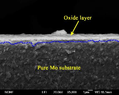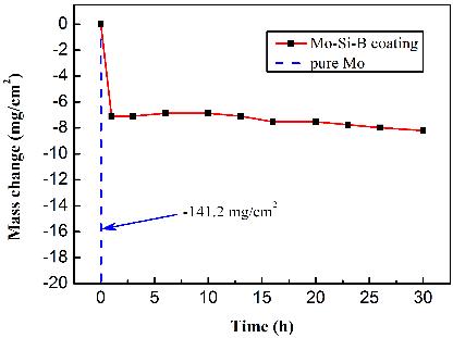 图7 纯钼基体与Mo-Si-B合金涂层在1300℃高温下氧化动力学曲线及氧化后纵截面组织
