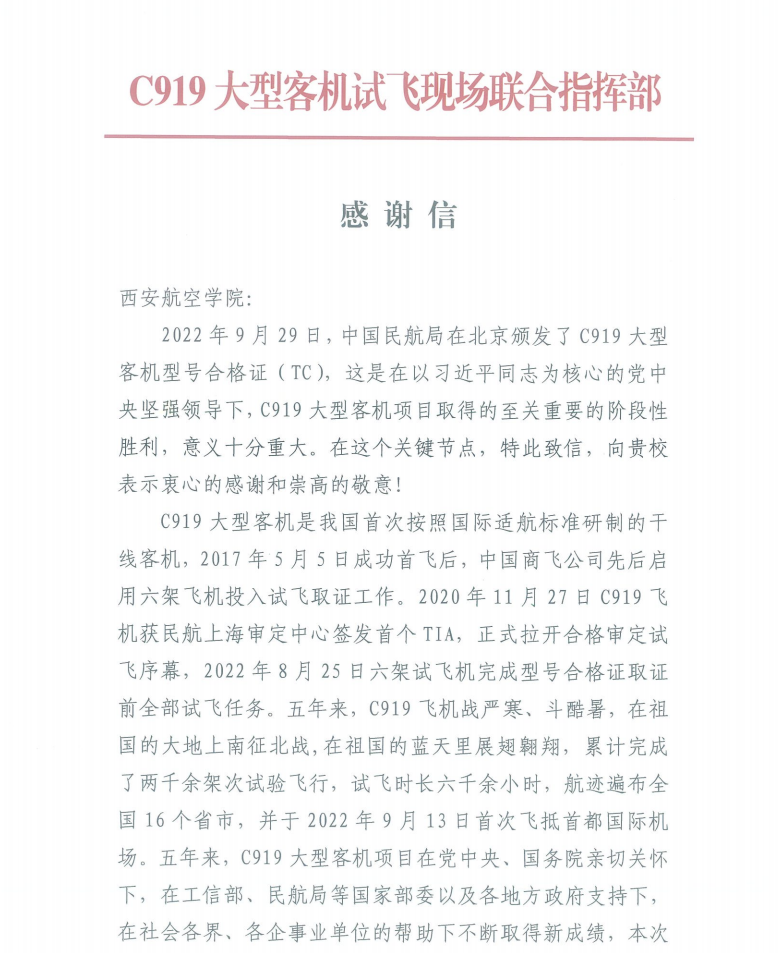 近日,C919大型客机试飞现场联合指挥部向学校发来感谢信,对我校在C919项目取证试飞工作中作出的贡献,特别是开云kaiyun体育材料实验研究中心全力、快速、无偿地帮助完成缝翼伸缩线缆紧固件断口分析过程中给予大力支持表示衷心感谢。