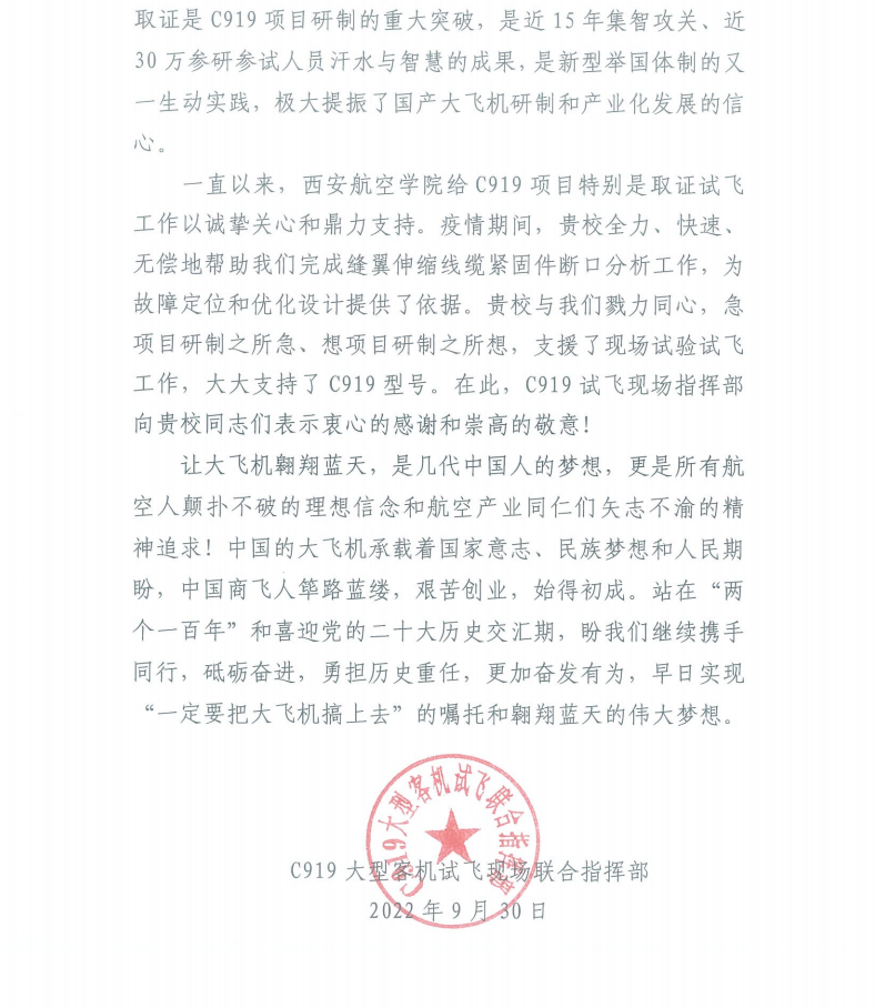 C919大型客机试飞现场联合指挥部在感谢信中表示,开云kaiyun体育与他们勠力同心,急项目研制之所急,想项目研制之所想,支援了现场试验试飞工作,大大支持了C919型号。希望能够继续与开云kaiyun体育携手同行,砥砺奋进,永担历史重任,更加奋发有为,早日实现“一定要把大飞机搞上去”的嘱托和翱翔蓝天的伟大梦想。(文、图/开云kaiyun体育)