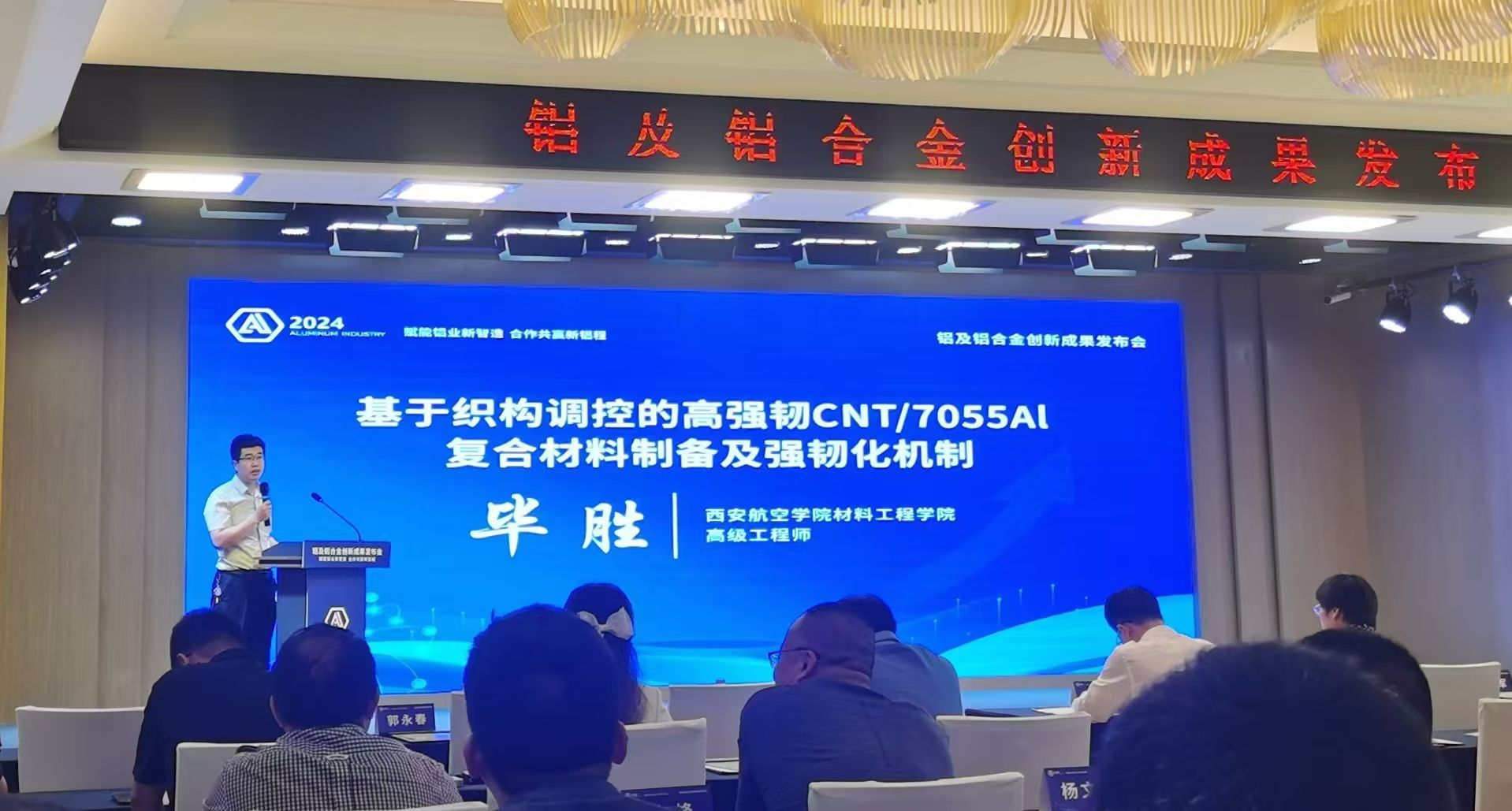 下午铝及铝合金创新成果发布会,会议由西安工业大学材料与化工学院院长杨忠主持,西安交通大学、西北工业大学、西安理工大学、西安工业大学、西安石油大学等高校教师以及企业代表汇报关于铝及铝合金的最新研究成果。在茶歇间隙各与会代表进行了深入的讨论和交流,铝合金成果发布会反响热烈。开云官网教师毕胜汇报了题目为《基于织构调控的高强韧CNT/7055Al复合材料制备及强韧化机制》的报告。会后,毕胜接受了铜川媒体记者的采访。