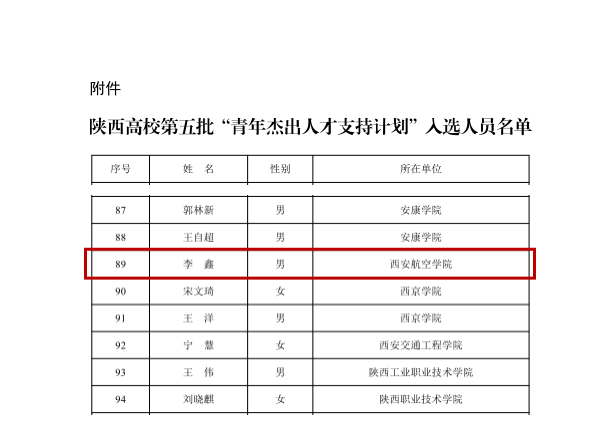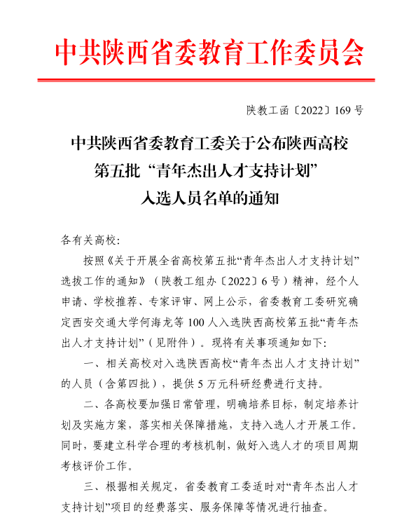 近日,中共陕西省委教育工委公布了陕西高校第五批“青年杰出人才支持计划”入选名单,开云官网开云kaiyun体育教师李鑫入选此支持计划。