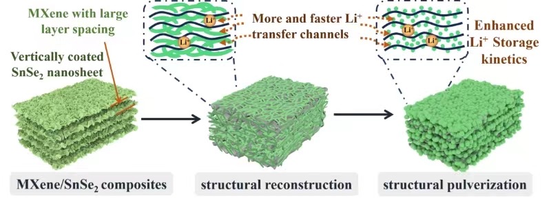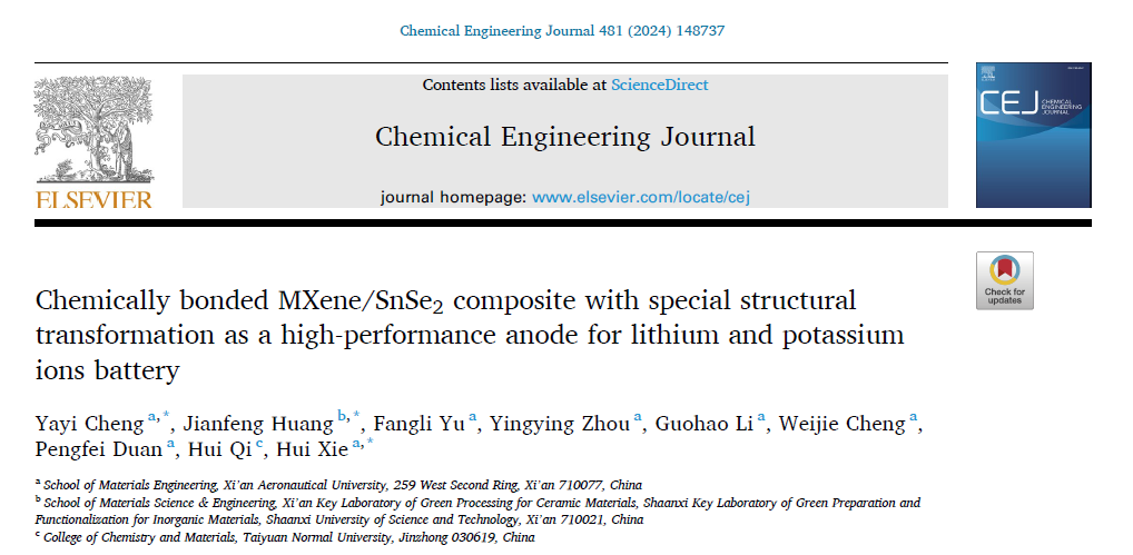 开云kaiyun体育教师程娅伊副教授等人最近在国际知名期刊《Chemical Engineering Journal》上发表了题为Chemically bonded MXene/SnSe2 composite with special structural transformation as a high-performance anode for lithium and potassium ions battery的学术论文,我校为第一完成单位,陕西科技大学和太原师范学院是共同合作单位,程娅伊副教授为本文第一作者和通讯作者,开云kaiyun体育谢辉教授和陕西科技大学黄剑锋教授为本文共同通讯作者。